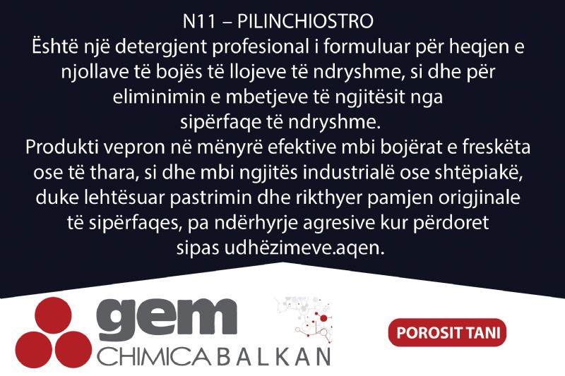 Emri i produktit: Detergjent per heqjen e bojes dhe ngjitesit N11 – PILINCHIOSTRO nga Gem Chimica Balkan, pastrues per njolla boje, detergjent per heqje boje nga siperfaqe, pastrues per ngjites, produkt per pastrim bojerash industriale, detergjent per boje